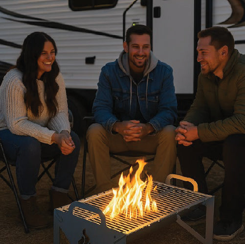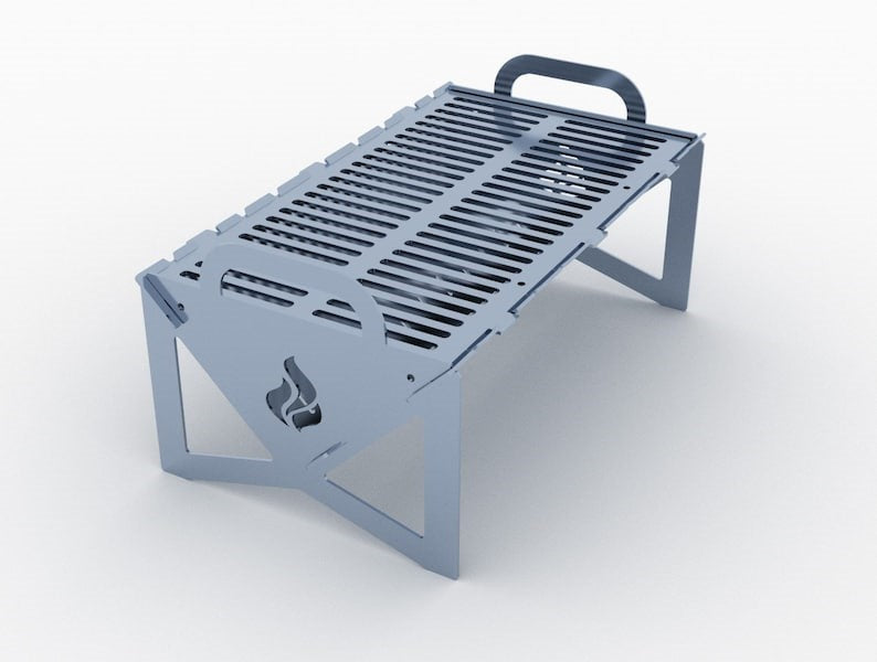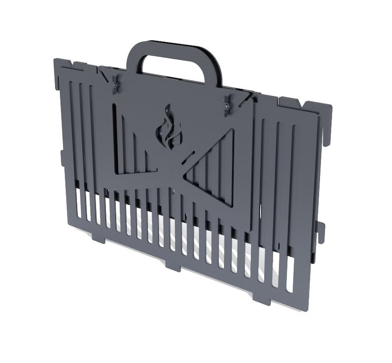 Compact. Rugged. Ready to roam. This FirePort is a fold-flat fire pit and grill built from heavy-duty steel for life on the go. With integrated handles and a slotted cook surface it's perfect for grilling trailside, beachside, or fireside.